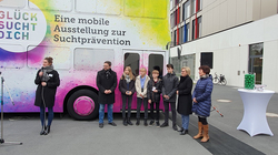 Mit einem Grußwort der sächsischen Gesundheitsministerin, Barabara Klepsch, wurde am 12.12.2019 ein neues Angebot zur Unterstützung der Suchtprävention in den sächsischen Regionen auf dem Schulcampus Dresden-Tolkewitz eingeweiht. GLÜCK SUCHT DICH ist eine interaktive Ausstellung innerhalb eines Doppeldeckerbusses, die mit insgesamt 8 Stationen zur Auseinandersetzung mit den Themen Glück und Sucht anregen soll. Zielgruppe sind Kinder und Jugendliche der Klassenstufen fünf bis zwölf, aber auch die breite Öffentlichkeit zur Sensibilisierung vor den Gefahren im Zusammenhang mit legalen und illegalen Drogen als auch zu verhaltensbezogenen Suchtproblemen, wie Medienabhängigkeit. Die fachliche Betreuung erfolgt durch die "Fach- und Koordinierungsstelle Suchtprävention Sachsen" in gemeinsamer Trägerschaft von SLFG e.V. und SLS e.V.