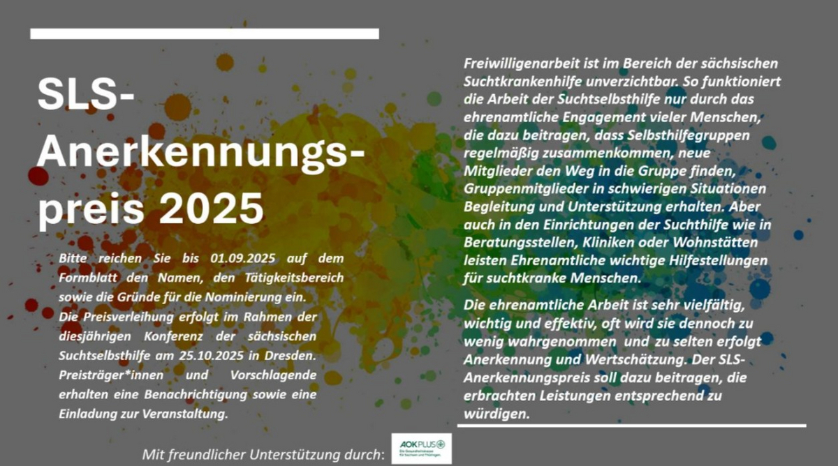 Gleichzeitig wollen wir hoffnungsvoll in die Zukunft blicken und laden Sie bereits jetzt zum SLS-Fachtag am 06.05.2026 zum Thema: „Geschlecht.Sucht. Stigma. Unterschiede in den Geschlechtern in der Suchthilfe“ im Deutschen Hygienemuseum Dresden herzlich ein.